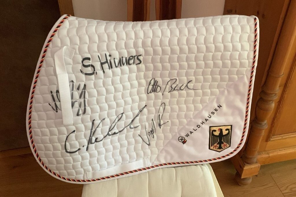 Bei der Satteldecke handelt es sich um die offizielle Ausrüstung der Deutschen Springreiter, die anlässlich der Europameisterschaft in Spanien die Team - Bronzemedaille gewinnen konnten. Und nicht nur das, alle Teammitglieder einschließlich des Bundestrainers Otto Becker haben die Decke höchstpersönlich signiert. Einzeleuropameister Richard Vogel, gebürtig aus Binzwangen, hatte die Idee und brauchte seine Kollegen Sophie Hinners, Markus Ehning und Christian Kukuk nicht lange zu bitten.
