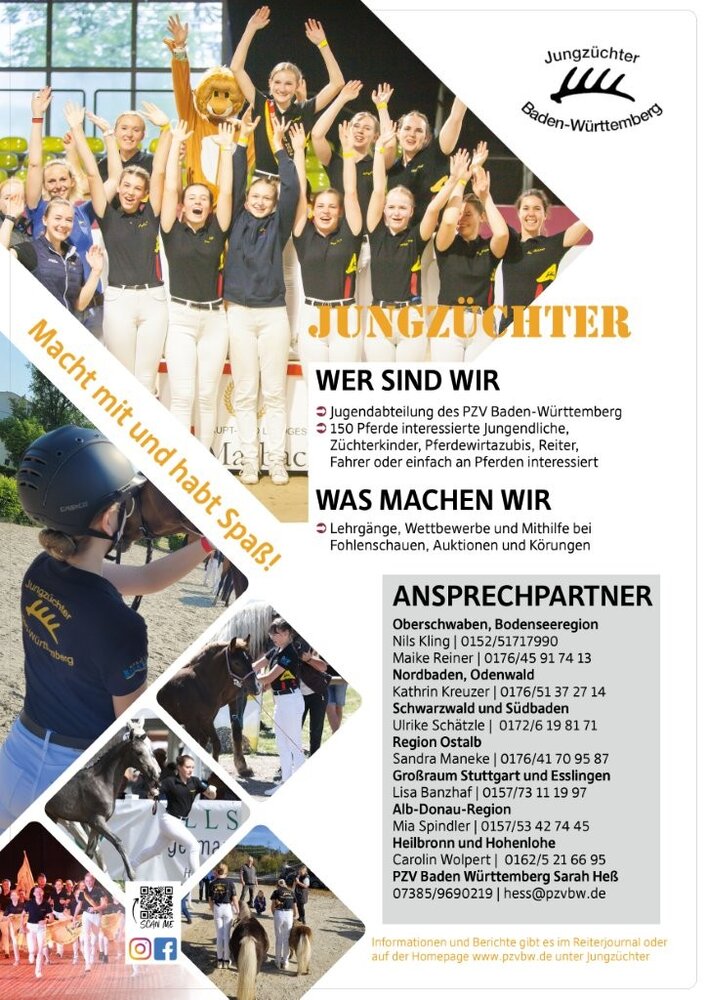Die Jungzüchter Baden-Württemberg sind eine stetig wachsende Gruppe Jugendlicher und junger Erwachsener im Alter von 10 bis 25 Jahre, verteilt im ganzen Ländle. Sie haben sich in der 1996 gegründeten Organisation „Jungzüchter Baden-Württemberg“, unter der Betreuung des Pferdezuchtverbandes Baden-Württemberg zusammen getan. Die Mitarbeiter der Geschäftsstelle unterstützen uns hilfreich. Alle Jungzüchterbeauftragten arbeiten ehrenamtlich.