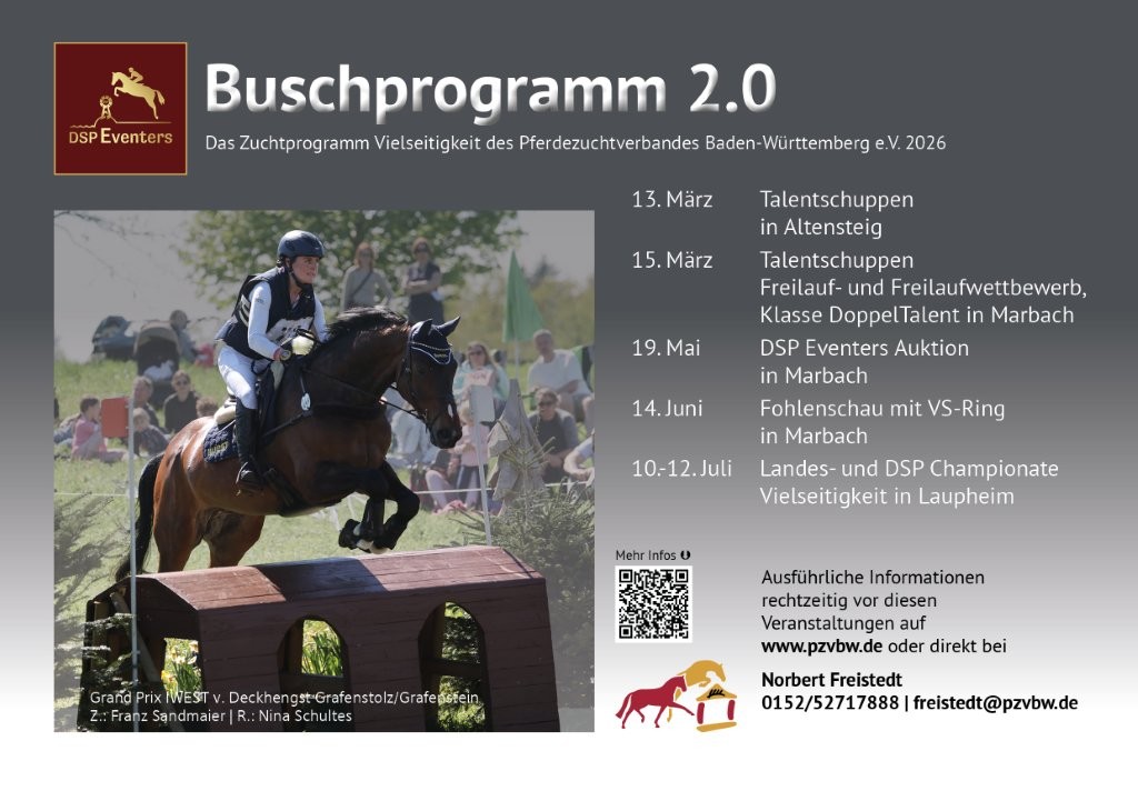 Um die Zucht von vielseitig veranlagten Pferden zu fördern, hat der Pferdezuchtverband Baden-Württemberg e.V. im Jahr 2012 das „Buschprogramm“ ins Leben gerufen. Neben dem Einsatz von Zuchttieren mit hohem Edelblutanteil für den Spitzensport soll auch die Nachfrage nach Doppeltalenten für den gehobenen Freizeitbereich profitieren. Konkret wird folgendes Ziel verfolgt: Für den Vielseitigkeitssport soll ein typvolles, leichtfüßiges Springpferd mit guten Grundgangarten und überdurchschnittlichem Vollblutanteil gezüchtet werden, wobei letzteres in den unteren Klassen nicht von entscheidender Bedeutung ist. Für den gehobenen Freizeitbereich sind Temperament, „Sitzkomfort“ und Rittigkeit weiterhin im Fokus. Bei der Anpaarung ist ein Vollblutanteil von min. 40 % aus fünf Generationen anzustreben, idealerweise 60 bis 80 %, verbunden mit springbetonter Genetik.