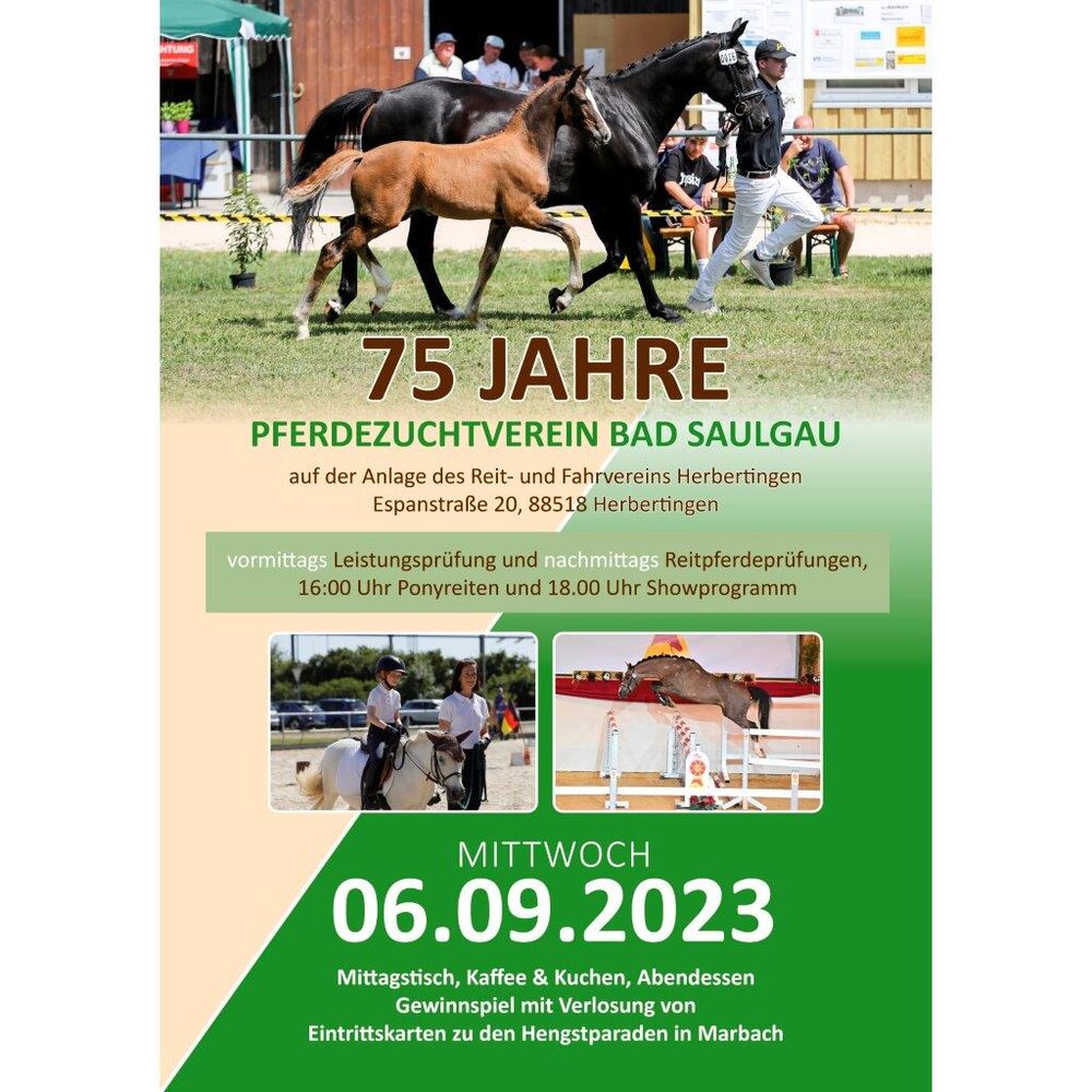Am Mittwoch, 6. September 2023 feiert der Pferdezuchtverein Bad Saulgau den 75. Jahrestag seiner Wiedergründung und lädt dazu auf die Reitanlage des Reit- und Fahrvereins Herbertingen ein.