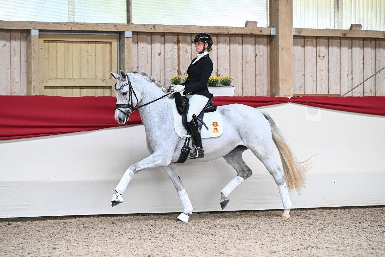 Sie ist nicht nur eine auffällige Erscheinung, ihr Name ist auch Programm: Die fünfjährige Schimmelstute First Lady war nicht nur erstes Lot des Bid Up, sie avancierte auch zur Preisspitze: Bei 61.000 Euro fiel der virtuelle Hammer für die DSP-Tochter des Grand Prix-Hengstes For Romance I aus einer Stute von Come On-Mowgli-Moltke I – klassische Dressurgenetik gepaart mit einer Holsteiner Mutterlinie, ein züchterisches Konzept, das aufging. Die Mutter, Come On-Tochter Cous-Cous, war in Springen bis Klasse S erfolgreich, ihre Schwester sammelte im Viereck Erfolge bis Klasse S. First Lady selbst, die als Turnierpferd nach dem bekannten Züchterhaus, der Pfefferle GmbH im oberschwäbischen Mengen, mit dem Präfix „PBM“ eingetragen ist, feierte bereits Siege in Dressurpferdeprüfungen bis Klasse L und wurde mit Rittigkeitsnoten bis 9,5 bewertet. Schon im Vorfeld der Auktion war das Interesse an der Ausnahmestute groß, ihre neuen Besitzer – die Stute wurde Kunden in den USA zugeschlagen – hatten nichts dem Zufall überlassen und eigens eine Testreiterin geschickt. Offensichtlich fühlte sich auch diese im Sattel der rittigen Lady wohl.