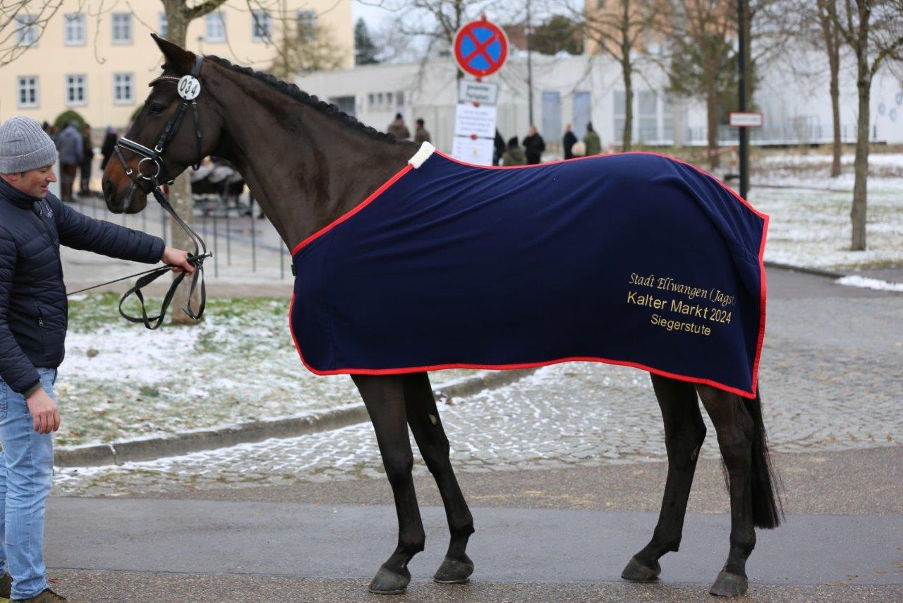 Die traditionelle Pferdeprämierung beim Ellwanger Kalten Markt, die Pferdekennern einen ersten Überblick über nachwachsende Talente und die weitere Entwicklung älterer Stuten bietet, fand am Montag nach Dreikönig erstmals im ehemaligen Kasernenbereich der Bundeswehr an der Reinhardstraße statt. Das bisherige Ausstellungs-Gelände am „Schießwasen“ stand nicht mehr zur Verfügung, da es bereits für die Landesgartenschau 2026 umgestaltet wird. Bei recht frostigen Temperaturen wurden Warmblut- und Kaltblutstuten sowie alle Kleinpferde im großen Hof bewertet. Für die Gespanne stand ein Hof in der Nähe zur Verfügung. Die Preis-Verleihung und Kommentierung der Siegerinnen fand wie gewohnt vor der städtischen Musikschule statt. Die Zahl der vorgestellten Stuten war mit 47 deutlich niedriger als im Vorjahr, als 88 Stuten präsentiert wurden. Die Zahl der Gespanne ging von 18 auf 14 zurück. Die Verlegung der Prämierung, die frostigen Temperaturen, aber auch die landesweiten Schlepper-Proteste von Landwirten mit vielen Straßensperrungen dürften zu diesem Rückgang beigetragen haben