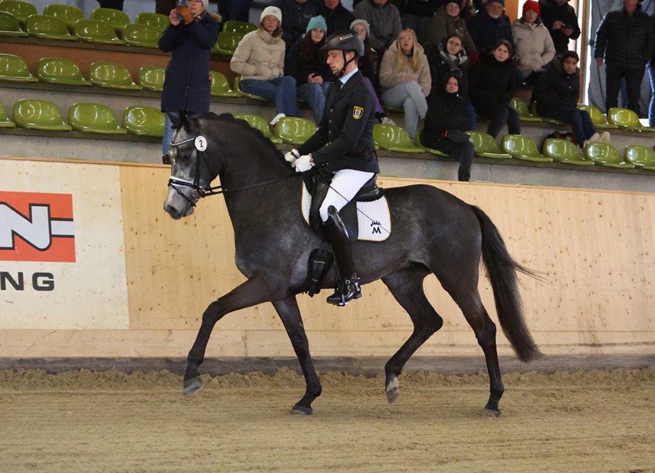 Sein neuer Boxennachbar wird der sehr typvoll aufgemachte Trakehner Hengst Tanzfürst von Dezember/Herzruf (Z: Hessische Hausstiftung Gestüt Panker/ B: Ge-stüt Grafing). Der Schimmel bewegt sich leichtfüßig und immer gut ins bergauf. Auch im Schritt zeigte er sich immer geregelt mit gutem Vor- und Übertritt. Ein weiterer Trakehner wird seine Box in Offenhausen beziehen. Dramatic Dancer von Goldschmidt/Handryk (Z: Peter Kunath) überzeugte bereits bei der Sattelkörung des Trakehner Verbands im November. Mit hohen Rittigkeitswerten und gutem Interieur ausgestattet, zeigte er sich unter dem Sattel von Lukas Maier bereits sehr ausbalanciert und mit drei ausgeglichenen Grundgangarten. Der im mittleren Rahmen stehende Solomeo von So Unique/Totilas (Z: Wilhelm Klausing GbR) wurde Anfang November in Verden gekört und konnte auch bei der Marbacher Winterkörung überzeugen. Mit einem aktiv unter den Körper arbeitenden Hinterbein bewegt sich Solomeo leichtfüßig und immer gut bergauf. Auch er wird den Züchtern über die Besamungsstation in Offenhausen zur Verfügung stehen.