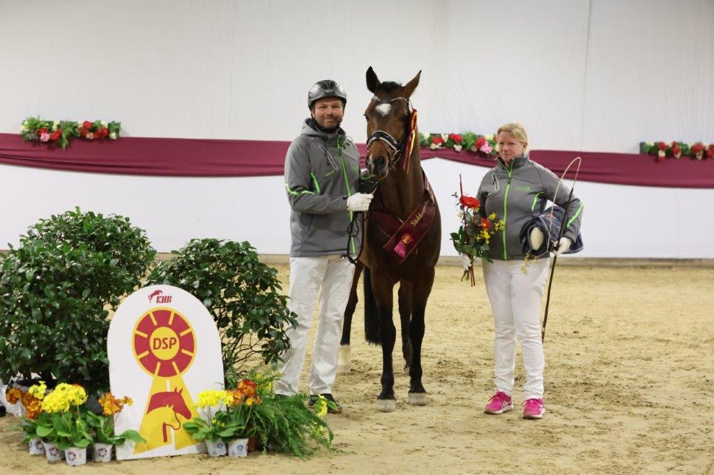 Der Siegerhengst First Class Royal King vom Crown Charm of Royal präsentierte sich bei der Körung als ein sehr typstarker und sportlicher Hengst mit einem modernen Erscheinungsbild. Er zeigte einen guten Hengstausdruck, der durch sein herrliches Gesicht mit schönem Auge und einer gut aufgesetzten Halsung besondere Bedeutung erhielt. Die harmonisch geschwungene Oberlinie des Hengstes und das gewünschte Rechteckformat ergaben eine gute Dreiteilung mit einer schönen Bergauftendenz. Das trockene und solide Fundament wurde in seiner Optik durch die langen Zehen der Vorderhufe leider etwas gestört. Der Schritt des Hengstes wirkte anfangs etwas eilig, verbesserte sich jedoch im Laufe der einzelnen Körvorstellungen stetig und wurde immer gelassener und ergiebiger. Im Trab zeigte First Class Royal King einen guten Antritt, war stets bergauf und mit einer guten Elastizität ausgestattet. Der Galopp war anfangs noch etwas festgehalten, verbesserte sich jedoch im Laufe des Freispringens. Beim Freispringen zeigte er sich vorsichtig, mit viel Übersicht guter Manier und Technik sowie gutem Vermögen. Dem Siegerhengst sollte durch seine Farbe, seinem Erscheinungsbild und seinem sportlichen Auftreten eine gute Zukunft bevorstehen.