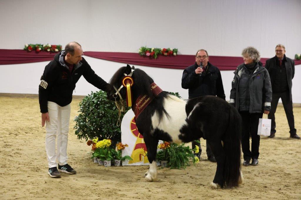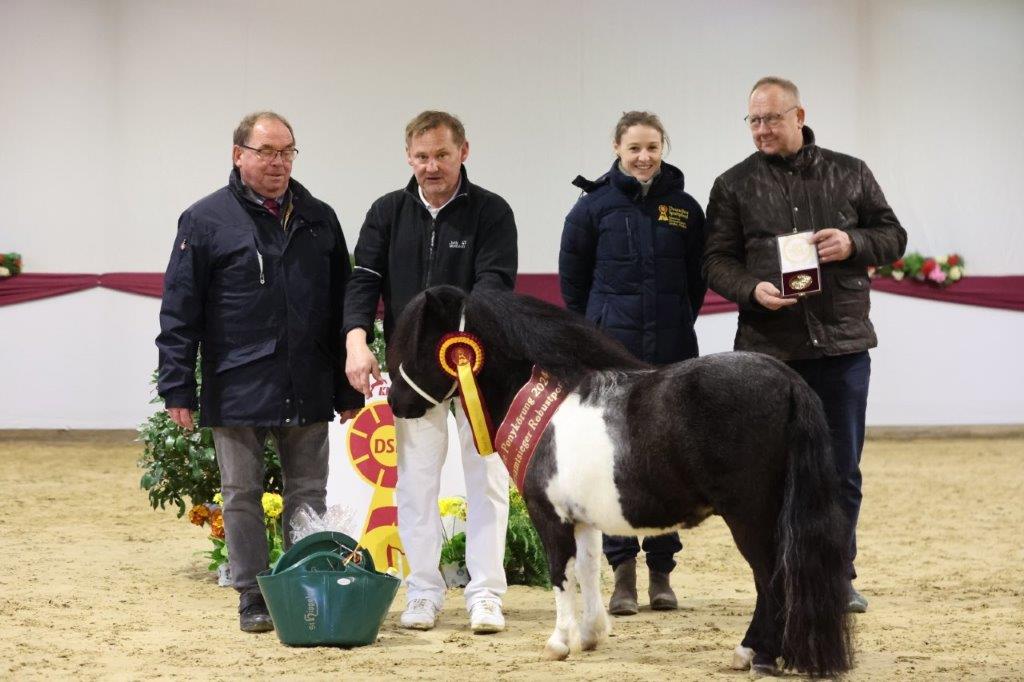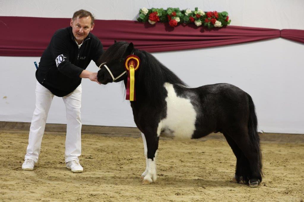 Mit dem Titel Prämienhengst dürfen sich künftig die Shetland-Hengste kleiner 87 cm Elmhorst Indian v. Elmhorst Irish Coffee und Rapp-Tigerschecke Bayerns Dusty v. Bayerns Duke (Züchter Reinhard und Sophie Stumhofer; Aussteller Lea Rodi) schmücken. Dieser kleine Star war im Galopp vor Freude über die große Halle kaum zu stoppen. Der Rapp-Isabell-Schecke Elmhorst Indian war zudem Siegerhengst der Robustponyhengstge. Der 83 cm große Mini-Shetlandhengst mit dem tollen Langhaar wurde von seinem Züchter Stephan Elmer ausgestellt.