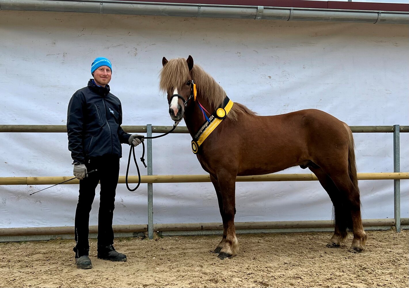 Der Sonntag startete mit etwas Regen, was die Körungsteilnehmer aber nicht davon abhielt auf dem Außenplatz ihr Bestes zu geben. Vorgestellt wurden 10 Hengste aus den Jahrgängen 2020 und 2021. Die Bewertung erfolgte mittels einer IPZV-Jungpferdebeurteilung, bei der die Pferde zunächst freilau-fend danach zur Exterieurbeurteilung aufgestellt und schließlich in Schritt und Trab an der Hand be-gutachtet wurden. Die Richterinnen Marlise Grimm und Nicole Kempf bewerteten gewissenhaft 39 Einzelmerkmale jedes vorgestellten Pferdes und fassten die Vorstellung jeweils in einem passenden Richterspruch zusammen. Zur Freude aller Beschicker konnte Zuchtleiter Manfred Weber anschlie-ßend allen Hengsten ein positives Körurteil bekanntgeben. In der Klasse der 3-Jährigen setzte sich Arnar frá Skipaskaga im Besitz von Michelle Günther mit einer Gesamtnote von 8,16 an die Spitze. Sieger der 4-Jährigen und Körungssieger wurde mit 8,20 Samúel frá Vísindahofi aus der Zucht und im Besitz von Rebecca und Bernhard Podlech.