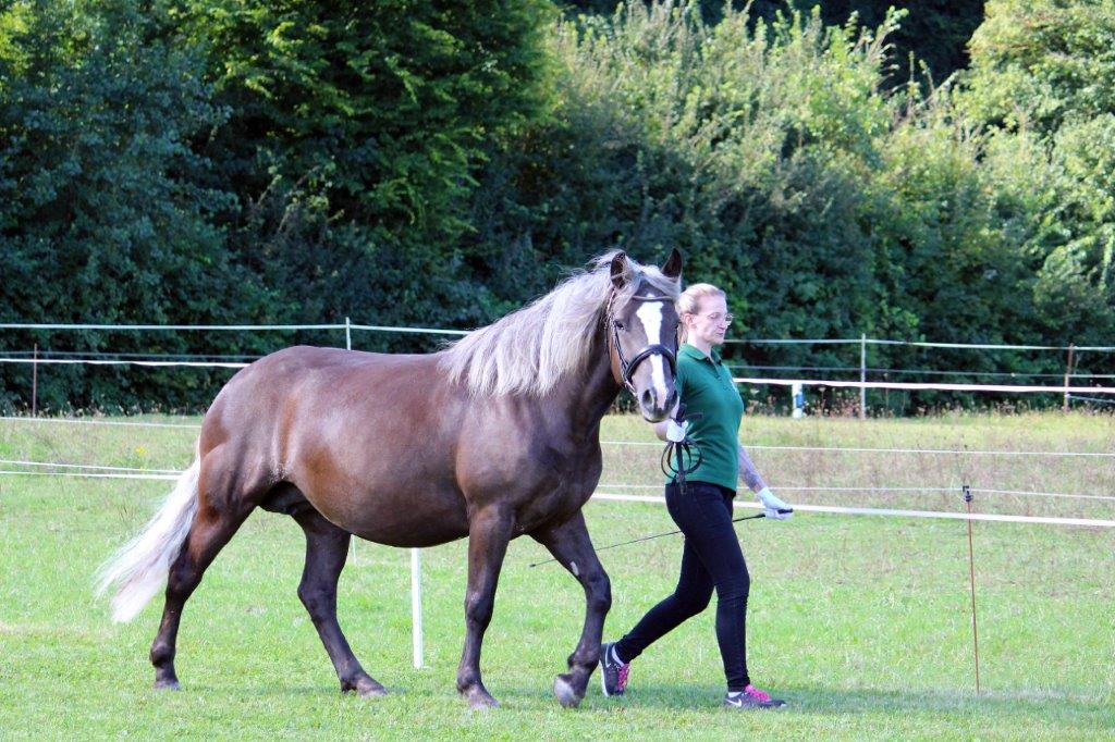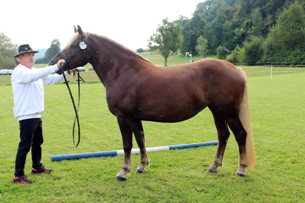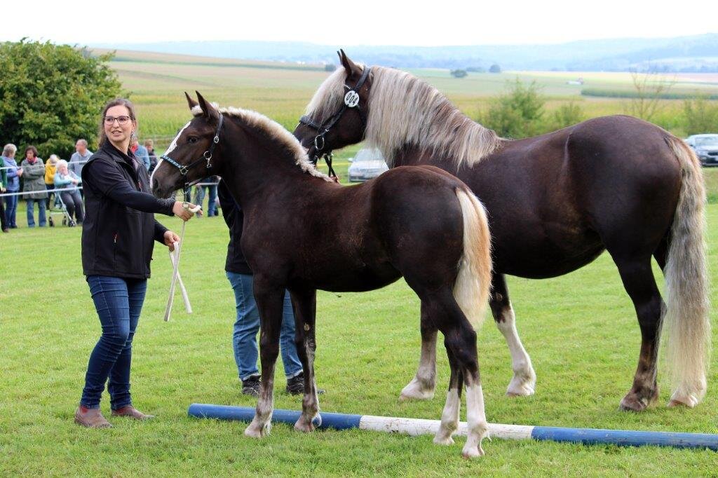 Zum Abschluss der Fohlenschausaison 2024 machten die Richter Helmut Faller und Zuchtleiter Manfred Weber Station im nordhessischen Trendelburg auf dem herrlich vorbereiteten Gelände bei Familie Meimbresse. Zur Fohlenbewertung waren zehn Schwarzwälder- und ein Reitponyfohlen sowie sechs Stuten zur Eintragung in das Zuchtbuch gemeldet. Alle gemeldeten Fohlen und Stuten wurden bei regem Zuschauerinteresse und angenehm spätsommerlichen Temperaturen auch vorgestellt. Drei Fohlen wurden mit Gold und acht mit Silber prämiert, alle Stuten konnten in das höchstrangige Stutbuch eingetragen werden. Als beste Stute der Kollektion der zur Eintragung vorgestellten Stuten stellten die Richter die dreijährige Helen von Rubinrot aus einer Mutter von Domingo aus der Zucht und dem Besitz von Roland Spangenberg heraus. Eine weit entwickelte typvolle Stute im guten Rahmen mit gutem Körperschluss und ergiebigem Schritt. Mit der zweithöchsten Eintragungsnote gefiel eine Tochter des Elitehengstes Moritz aus der Zucht und dem Besitz von Lilo-Charlott Fülling. Eine typgefällige Stute mit charmantem Gesicht.