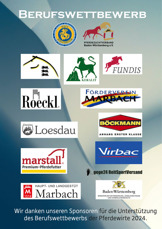 Ein großes Dankeschön geht an die Organisatorinnen Dr. Carina Krumbiegel, Miriam Abel, Sibylle Weber und Dr. Andrea Pfirrmann, an die Richterkommissionen und Markus Lämmle mit Team sowie an die Sponsoren: Böckmann Fahrzeugwerke GmbH, Bundesvereinigung der Berufsreiter, Förderverein Marbach, Fundis Reitsport, Gege Reitsportversand, Haupt- und Landgestüt Marbach, Keralit Veterinär- und Pferdetechnik GmbH, marstall GmbH, Ministerium für Ernährung, Ländlichen Raum und Verbraucherschutz Baden-Württemberg, Pferdesporthaus Loesdau GmbH & Co.KG, Pferdesportverband Baden-Württemberg e.V., Pferdezuchtverband Baden-Württemberg e.V., Roeckl Sporthandschuhe, Virbac Tierarzneimittel GmbH.