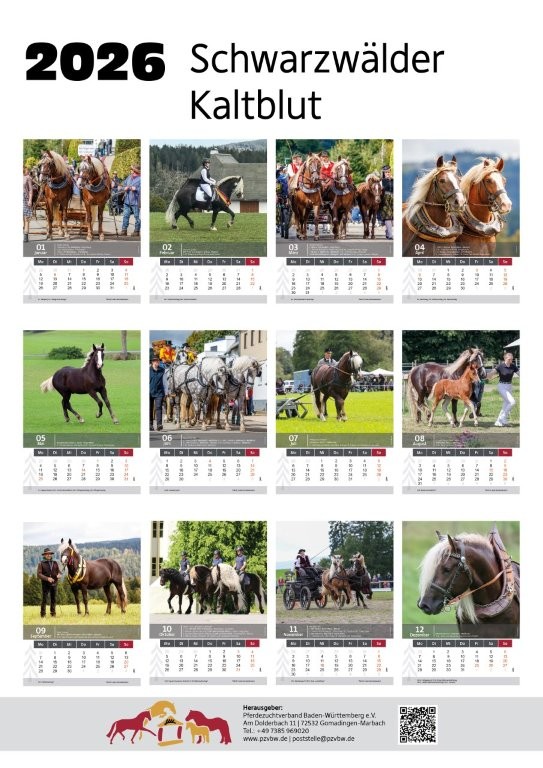 Die zwölf Motive zeigen Ereignisse rund um die Rasse Schwarzwälder Kaltblut mit Hengsten, Stuten und Fohlen in atemberaubenden Momente.