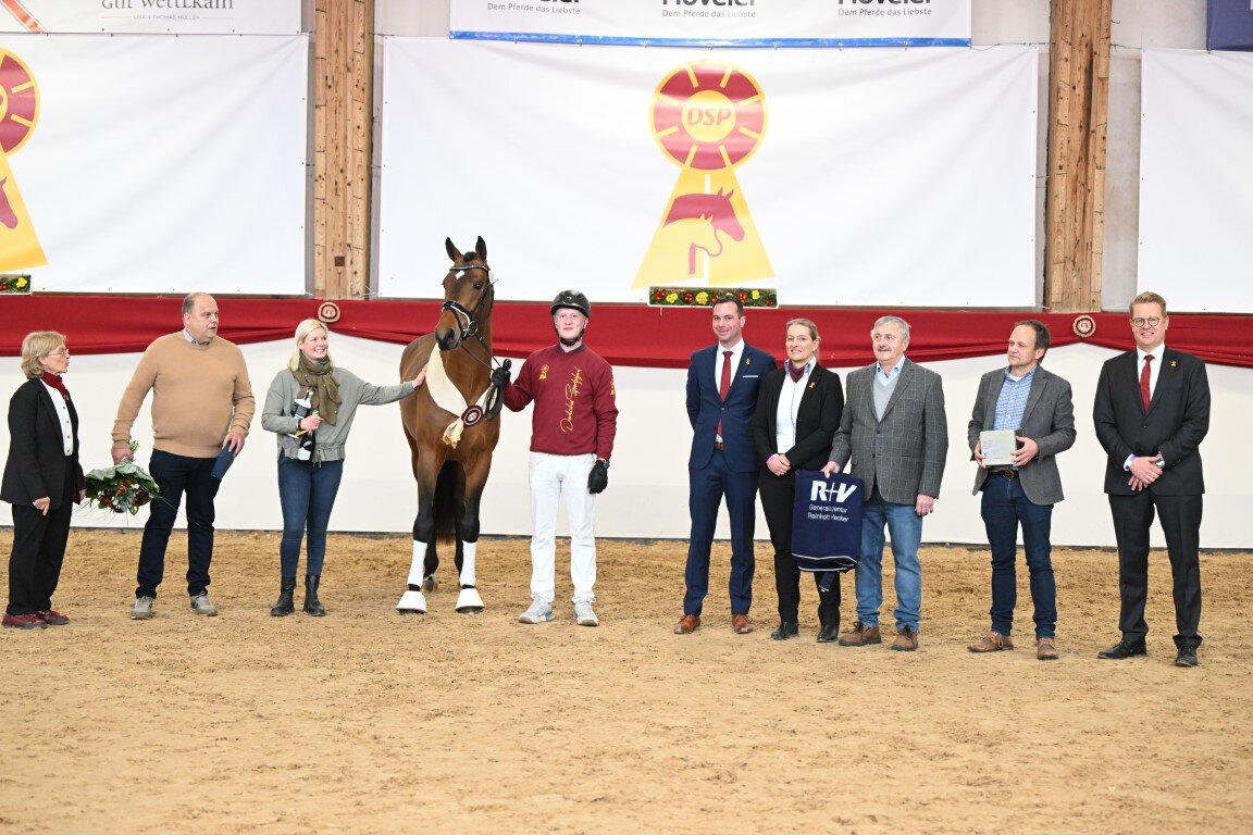 Auch der Dressur-Siegerhengst begeisterte Publikum und Körkommission gleichermaßen. Mit diesem Titel darf sich nun ein Sohn des Bonds aus einer Goldberg-Mutter schmücken. Er gehört dem wohl berühmtesten DSP-Mutterstamm, der Neustädter P-Familie, an, deren gekörte Hengste und sporterfolgreiche Nachkommen weltweit bekannt sind. Auch die Großmutter des DSP-Siegers, eine Stute von Rubin-Royal, ist bereits dreifache Hengstmutter. Züchter des Dunkelfuchses ist Hendrik Niehe aus Sieversdorf-Hohenofen, der sich über den Titel ebenso freute wie Matthias Alexander Rath als Vertreter des Gestüts Schafhof, das den Hengst ausstellte. Entdeckt hatte Rath den damaligen Hengstanwärter 2022 auf der DSP-Fohlenauktion, bei der alljährlich unter dem Motto „Kronjuwelen“ Hochkaräter zum Verkauf stehen. „Dieser Hengst war das absolute Highlight, jede Grundgangart für sich war ein Highlight,“ so Jörg Schrödter, der Sportkommissar Dressur, und fuhr fort: „Der Galopp ist besonders erwähnenswert. Ich glaube nicht, dass es besser geht. Dazu hat der Hengst eine besondere Ausstrahlung, er zieht einen in den Bann. Genau so muss ein Siegerhengst sein.“