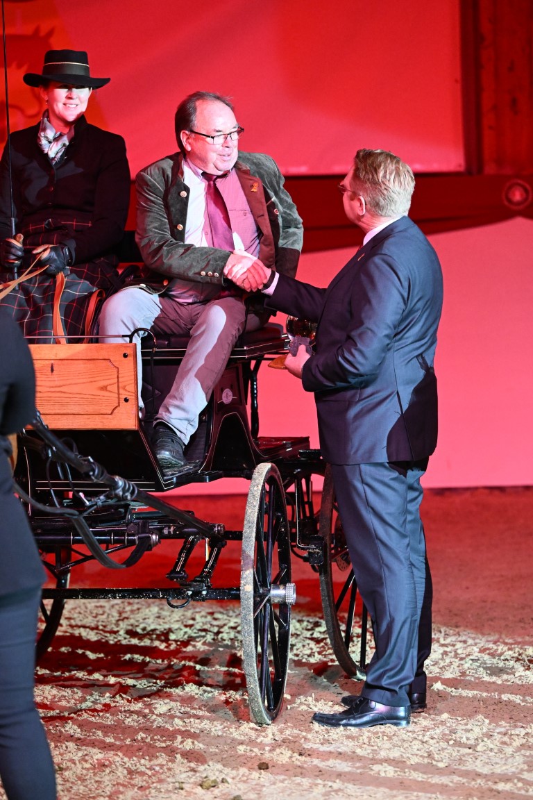 Der Einladung nach München waren Horst von Langermann und Detlef Schwolow gerne gefolgt, dass sie dabei selbst im Rampenlicht stehen würden, wussten sie lange nicht. Die eingeweihten Freunde hielten ebenso dicht wie das DSP-Team und so waren Überraschung und Freude groß, als die beiden verdienten Männer im Rahmen der Hengst-Gala des Deutschen Sportpferdes zu Kutschen gerufen und dann stilvoll in die Bahn gefahren wurden, wo die große DSP-Familie noch einmal von Herzen Danke sagte.