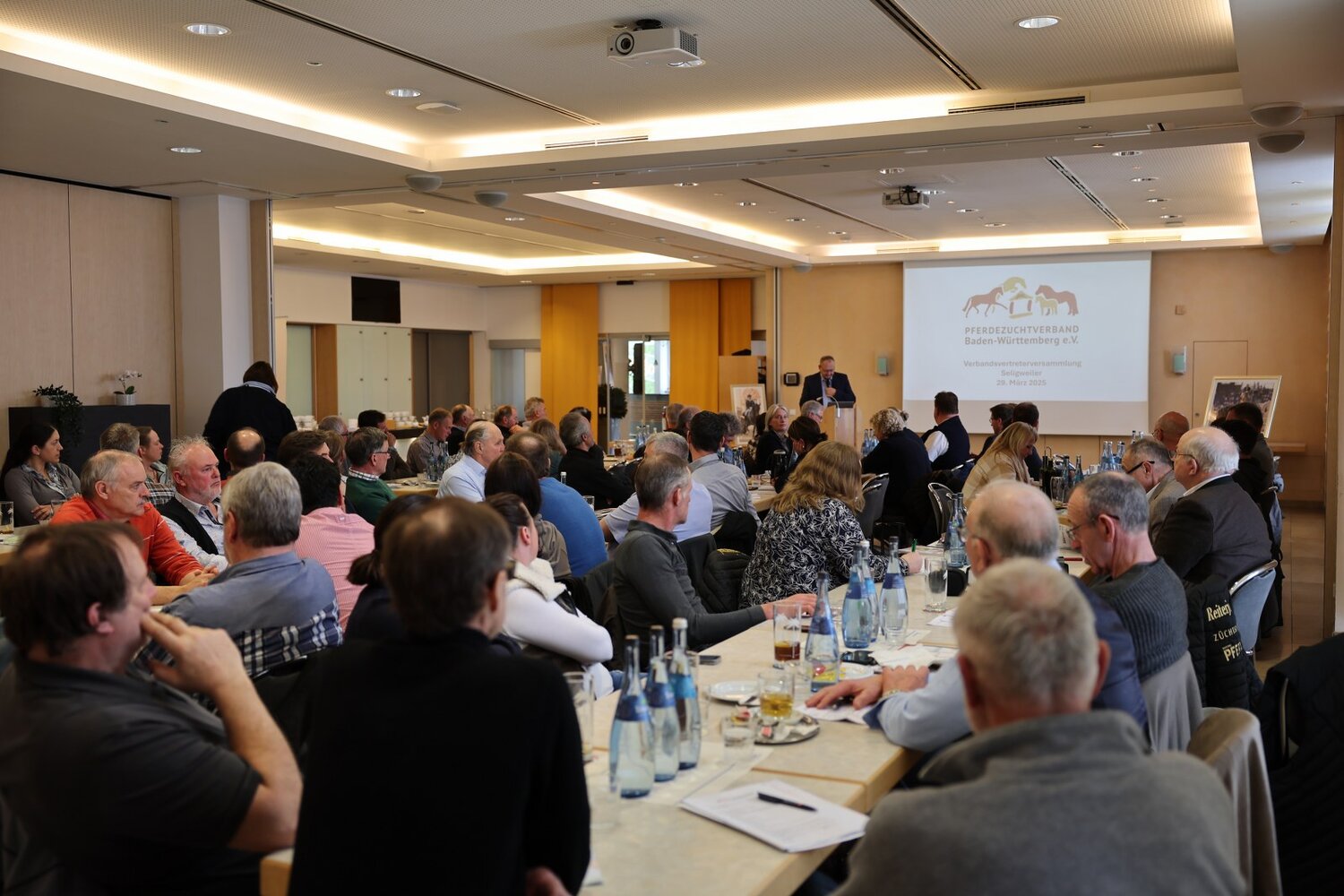 Zur Verbandsvertreterversammlung hatte der Pferdezuchtverband Baden-Württemberg e.V. nach Seligweiler bei Ulm geladen. Vor gut besetztem Saal (67 von 85 geladene Delegierte plus Gäste) begrüßte der erste Vorsitzende Edwin Schuster die Anwesenden und ging zu seinem Jahresbericht 2024 über. Dieser zeigte, entgegen dem bundesweiten Trend, erfreulicherweise ein leichtes Wachstum bei vielen Rassen, die Stuten- und Fohlenzahlen sind stabil. „Das war bei der eher vorsichtigen Prognose so nicht zu erwarten,“ so Schuster, der auch auf besonders erfolgreiche Pferde wie Aachen-Sieger Cepano Baloubet oder Bundeschampion Birkhof‘s Arezzo Man FBW verwies. Apropos Bundeschampionat, dort, und bei den DSP Championaten in Darmstadt waren Pferde aus Baden-Württemberg so erfolgreich wie nie zuvor. Die Zusammenarbeit zwischen DSP und Verband gestalte sich sehr harmonisch. In einer Bilderpräsentation wurde auf Veranstaltungen, wie beispielsweise die DSP Hengsttage, die Winterkörung in Marbach, aber auch die Islandpferdekörung und die insgesamt 22 Fohlenschauen zurückgeblickt. Aufgrund des krankheitsbedingten Fehlens von Schatzmeisterin Hannah Bott übernahm Geschäftsführer Norbert Freistedt im Anschluss die Vorstellung des Jahresabschlusses, der sich ebenfalls positiv liest. Der Verband beendete das Jahr 2024 mit neun Prozent Umsatzsteigerung und einem Ergebnis von knapp 29.000 Euro. Kassenprüfer Uwe Eberhardt bescheinigte eine einwandfreie Führung der Kasse woraufhin eine einstimmige Entlastung folgte. Für den Haushalt 2025, dem ebenfalls zugestimmt wurde, rechnet Norbert Freistedt mit rückläufigen Zahlen. Das Jahr und die Erfolge der Jungzüchter, zu denen unter anderem der Vizetitel beim Bundesjungzüchterwettbewerb in Marbach gehörte, stellte Lisa Banzhaf vor. Zuchtleiterin Dr. Carina Krumbiegel gab Einblicke in die Anzahl der Stuten und Fohlen der verschiedenen Rassen, die sich, im Vergleich zu anderen Bundesländern noch auf stabilem Niveau befindet. Auch im Hinblick auf die Vermarktung konnte Norbert Freistedt positive Töne anstimmen – so verliefen die Veranstaltungen, wie beispielsweise das Marbacher Wochenende erfolgreich und es konnten gute Durchschnittspreise erzielt werden. Ein wichtiger Baustein sei auch die DSP-Vermarktung. Insgesamt wurden 318 Pferde und Fohlen aus Baden-Württemberg bei einem Gesamtumsatz von 4,4 Mill. Euro verkauft.