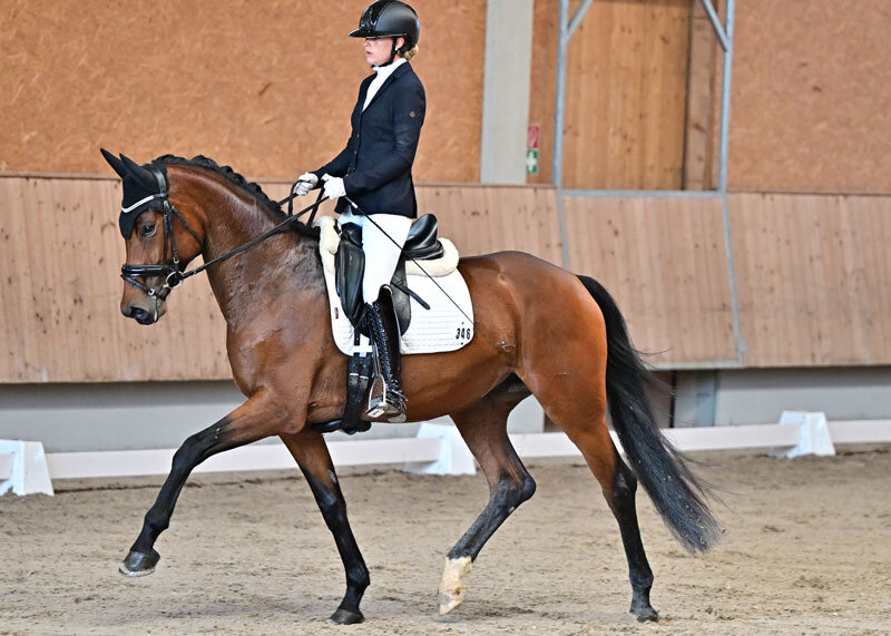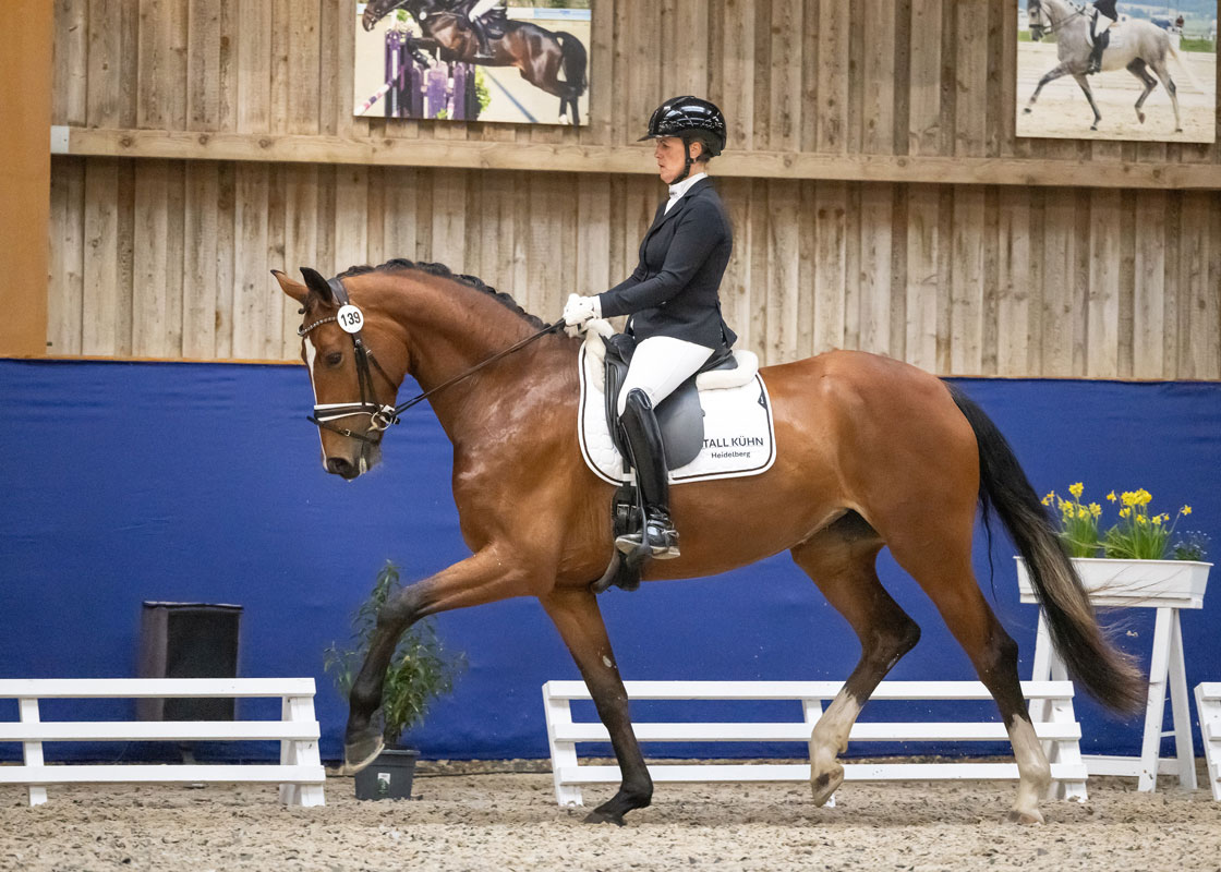 In Ladenburg ließ Florine keine Zweifel aufkommen: Die ausdrucksstarke Stute von For Dance aus einer Disco-Tänzer-Mutter sicherte sich unter Julia Kühn den Sieg mit einer hervorragenden Wertnote von 8,54. Florine stammt aus der Zucht von Werner Häfner und steht im Besitz der Stall Kühn GmbH.