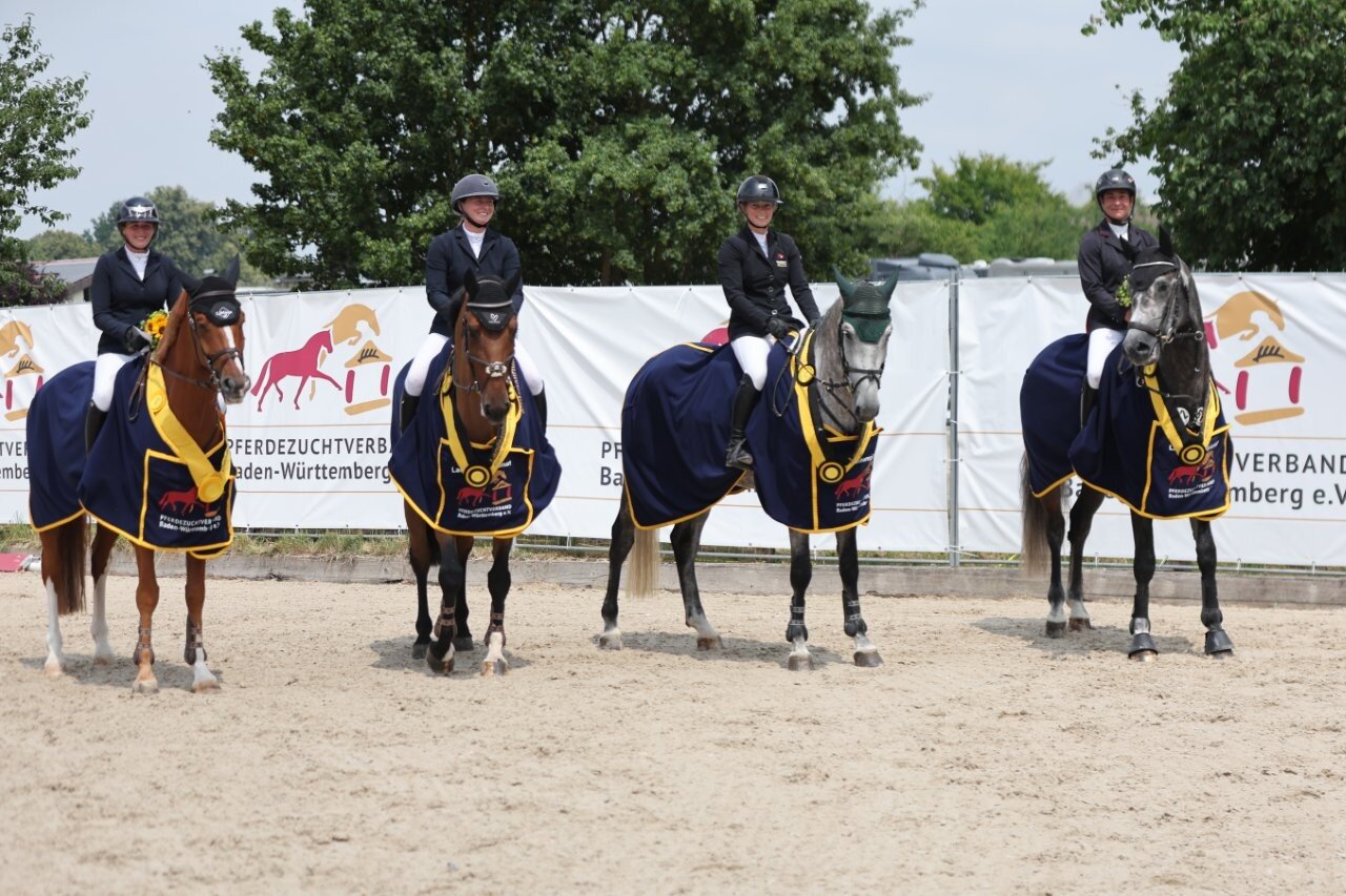 Zu Beginn noch etwas verhalten zeigten sich Ina Stahl und ihre hübsche Violetta. Im Laufe des Parcours nahm das Paar an Fahrt auf, jedoch wählte die Kaderreiterin meist die längeren Wege und damit stoppte die Uhr bei 36,17 Sekunden. Dass dies schneller ging, bewies die nächste Aspirantin, nämlich Mae Hoffer mit ihrer Wallis. Fehlerfrei sprangen die beiden in 35,30 Sekunden ins Ziel – neue Führung. Diese luchste ihr jedoch kurz darauf Emma Häfele ab. Im Umlauf noch mit Fehlerpunkten für die Zeit belastet, drückte die junge Amazone mit ihrem langbeinigen Carmilou nun ordentlich auf die Tube – 33,78 Sekunden lautete die neue Bestzeit. Mit Aufmerksamkeit verfolgt hatte ihren Ritt die folgende Starterin, nämlich Nike Bühner. Mit ihrer Kanndarca wählte sie stets die engen Wendungen und verschenkte keinen Meter. Damit nahm Nike Bühner der bis dato Führenden nochmals wenige Hundertstel ab. Alles in der Hand hatte nun Selina Nisch. Mit ihrer Holsteinerin Sathya legte sie zwar mit 32,73 Sekunden die absolute Bestzeit aufs Parkett, hatte jedoch am vorletzten Sprung einen Flüchtigkeitsfehler einbüßen müssen. Es wurde Rang fünf für die junge Dame aus Munderkingen, hinter Ina Stahl an vierter Stelle. Den Sieg verdient hatte sich damit Nike Bühner, gefolgt von Emma Häfele auf dem Silberrang. Das Podium komplettierte Mae Hoffer. Ebenfalls in die Platzierung sprangen Marla Schmailzl und Leonie Berres.