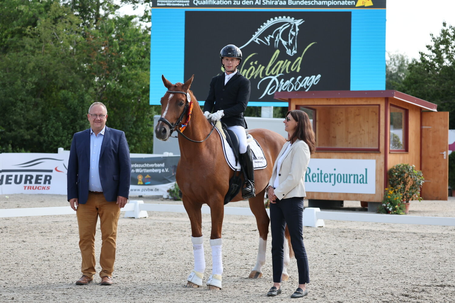 Der Morgen bei den Landeschampionaten in Weilheim/Teck startete mit der Finalentscheidung bei den fünfjährigen Dressurpferden. Hier erlebte man eine Geschichte, die sich wohl jeder Züchter und Pferdebesitzer erträumt. Nikolaus Kühn hat den fünfjährigen Fürst Magic-Sohn For Magic K (Fürst Magic-De Niro, B.: Irmgard Berendsen) selbst gezogen, ausgebildet und nun zum Landeschampion geformt. Eine traumhafte Geschichte, ja die Runde der beiden in Weilheim glich auch einer Traumrunde. „Das war eine tolle Prüfung“, lobte das Richtertrio, bestehend aus Sonja Pilton, Michaela Grupen und Tim Koch und fügte hinzu: „Gleich der Arbeitstrab präsentierte sich dynamisch und kraftvoll abfußend bei guter Schulterfreiheit“. Zudem überzeugten das hohe Gleichmaß und Taktsicherheit. Einen kleinen „Schönheitsfehler“ gab es als For Magic K in der ersten Volte kurz angaloppierte, aber direkt wieder einen energisch abfußenden Trab fand. Im Trab vergaben die Richter verdient die Note von 8,8. Der Schritt präsentierte sich gut schreitend mit ordentlichem Über- und Vortritt (7,8). Für eine noch höhere Note könnte der DSP-Wallach hier noch mehr aus der Schulter kommen. Die Dynamik aus dem Trab zog sich auch im Galopp durch und so zeigte sich dieser kraftvoll ins Bergauf springend (8,2). „Das Pferd besticht auch durch seine innere Gelassenheit und Losgelassenheit. Wir haben auch eine zufriedene Anlehnung gesehen“, erläuterte Tim Koch. Auch im gesamten zeigte sich For Magic K sehr sicher, was in der Rittigkeit zu einer 8,3 führte. Diese Note vergaben die Richter auch im Gesamteindruck, woraus eine Endnote von 8,28 resultierte. Das bedeutete nicht nur den Titel „Landeschampion der fünfjährigen Dressurpferde“, sondern ebenso das Ticket für die Bundeschampionate.