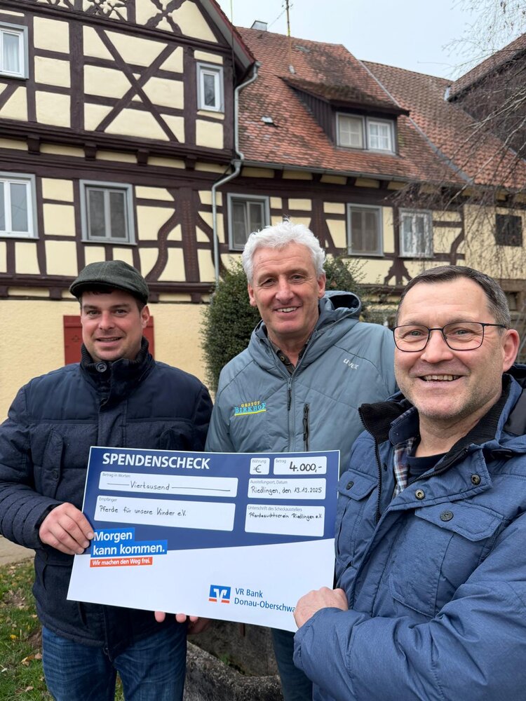 Das Jahr 2025 ist zu Ende und somit auch unser 75 Jähriges Vereinsjubiläum, das wir im Rahmen des traditionellen Riedlinger Fohlenmarktes mit einer Charity – Aktion zu Gunsten “Pferde für unsere Kinder“ anstelle eine Jubiläumsfeier abhielten. Mit tatkräftiger Unterstützung des Pferdezuchtverbandes Baden-Württemberg e.V. wurde zu Beginn der Auktion eine signierte Schabracke der Deutschen Springreiter die an der Europameisterschaft teilgenommen haben versteigert, eigens zu diesem Anlass reiste der amtierende Europameister im Springsattel Richard Vogel nach Riedlingen und startete die Auktion der Schrabracke mit dem ersten Gebot, zudem wurde ein Fohlen der Rasse Deutsches Partbred Shetlandpony im Minityp aus der Zucht von Lea Rodi für den Guten Zweck versteigert und es kam eine stattliche Summe zusammen. Wir möchten mit der Aktion als Pferdezüchter den Kindern denen es nicht immer möglich ist, den Umgang mit Pferden und somit das Pferd und den Pferdesport näher bringen. Nach etwas längerer Terminsuche wurde nun in der Vorweihnachtlichen Zeit der Spendenscheck an Thomas Casper als Mitinitiator des Vereins Pferde für unsere Kinder offiziell übergeben. Wir möchten uns hierbei nochmals bei allen Beteiligten dem Pferdezuchtverband BW und besonders bei Richard Vogel für die Organisation der Schabracke sowie seine Anwesenheit am Markt und der Pony Züchterin Lea Rodi für die Unterstützung aber auch bei den aktiven Käufern für das mitsteigern am Markttag bedanken denn ohne diese wäre eine solche tolle Aktion nicht möglich gewesen.