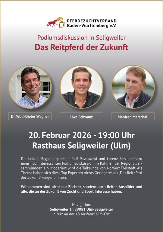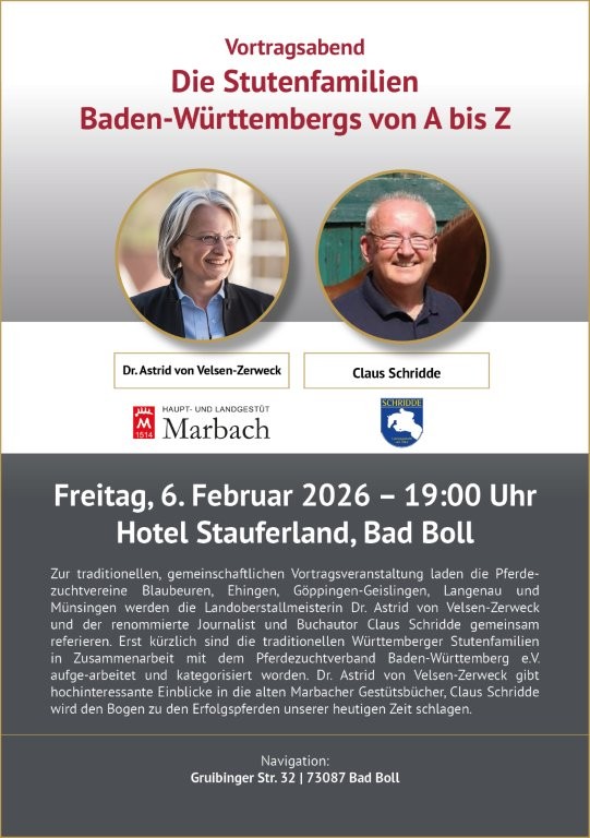 Am Freitag, 6. Februar 2026 um 19:00 Uhr laden die Pferdezuchtvereine Blaubeuren, Ehingen, Göppingen-Geislingen, Langenau und Münsingen herzlich zum gemeinsamen Vortragsabend ins Hotel Stauferland in Bad Boll ein. Landoberstallmeisterin Dr. Astrid von Velsen-Zerweck und der renommierte Journalist & Buchautor Claus Schridde geben spannende Einblicke in die neu aufgearbeiteten und kategorisierten Württemberger Stutenfamilien. Von den historischen Marbacher Gestütsbüchern bis hin zu den Erfolgspferden der Gegenwart spannt sich ein faszinierender Bogen durch Zuchtgeschichte und Moderne.