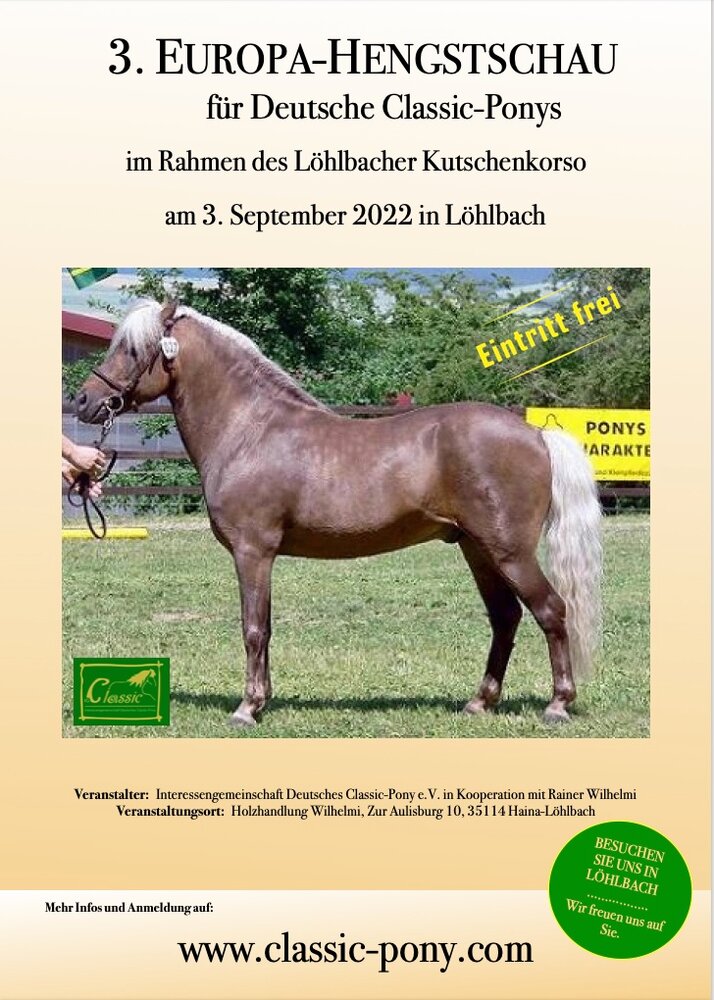 Am 03.09.2022 findet im Rahmen des Löhlbacher Kutschenkorso in Haina-Löhlbach/Hessen die Europa-Hengstschau der IG Classic für gekörte und eingetragene 3j. und ältere Classic-Pony-Hengste sowie eine Verwendungsklasse für Wallache und nicht gekörte Hengste der Rasse Deutsches Classic-Pony statt. ACSh Hengste können ebenfalls gemeldet werden, sowie zur Zucht des Deutschen Classic-Ponys eingesetzte Partbred- Shetlandpony Hengste, die vor dem Jahr 2000 geboren worden sind, bzw. bei ausländischen Zuchtverbänden entsprechend eingetragene Classic-Pony Hengste. Es werden wieder viele renommierte und bedeutende Classic-Pony-Vererber aus ganz Europa zu dieser Schau erwartet. Der alljährlich stattfindende Kutschenkorso Löhlbach, der von Rainer Wilhelmi ausgerichtet wird, ist in jedem Jahr ein Zuschauermagnet und begeistert seit Jahren Groß und Klein. Somit ist es ein großes Schaufenster für die Europa-Hengstschau der Interessengemeinschaft Deutsches Classic Pony. Besuchen Sie uns in Löhlbach! Wir freuen uns auf Sie!