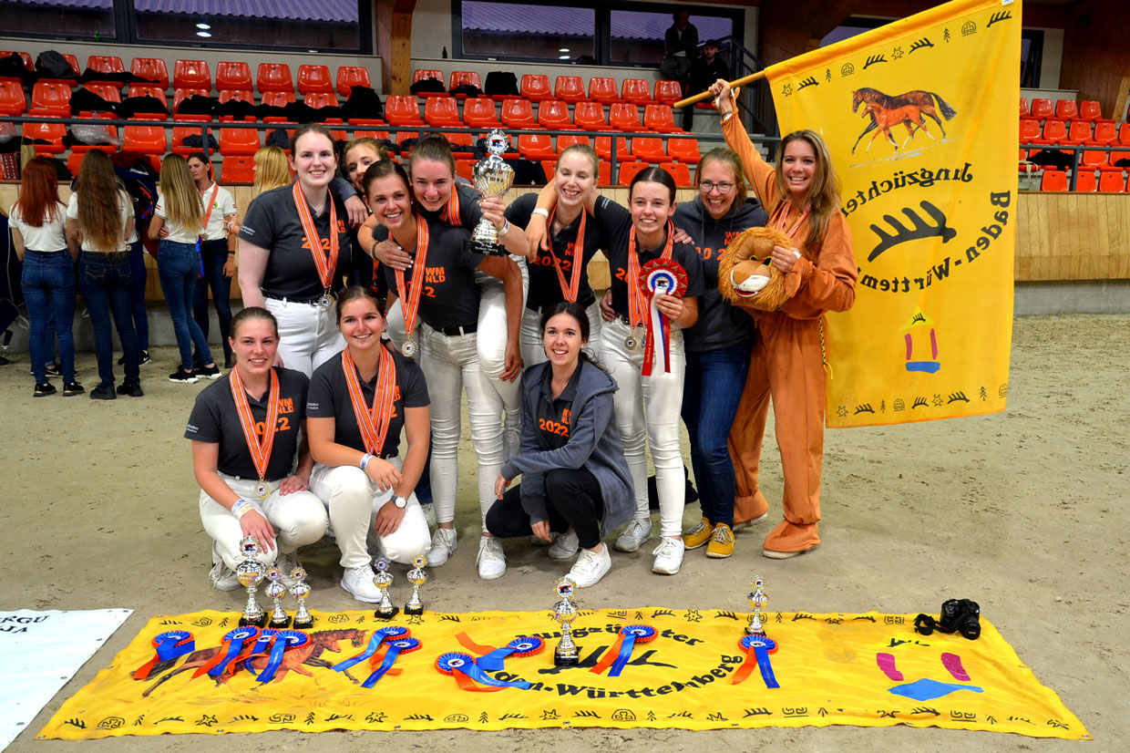 Vom 07. bis 10. Juli fanden im Nationaal Hippisch Centrum in Ermelo (Niederlande) die WBFSH World Championships der International Young Breeders statt, bei denen 20 internationale Teams von Kanada bis Lettland teilnahmen. Dazu angereist waren aus Baden-Württemberg ein Junior- und ein Seniorteam (16-19 und 20-25 Jahre), für das die Jungzüchter sich auf der Landesmeisterschaft auf dem Birkhof qualifiziert hatten. Bei den Junioren vertraten die Landesfarben Jasmin Gross, Sandra Maneke, Hanna Reiff und Maike Reiner, bei den Senioren gingen Lisa Banzhaf, Kathrin Kreuzer und Carolin Wolpert an den Start.