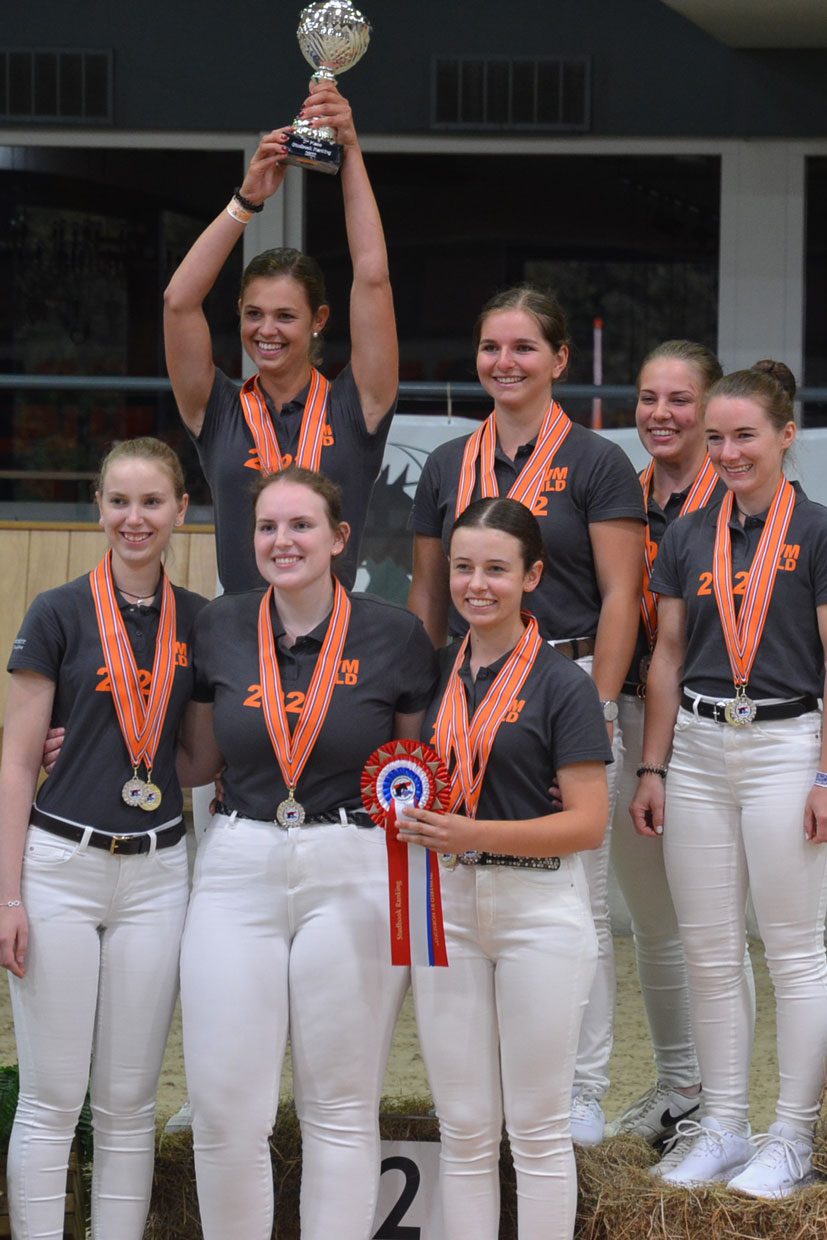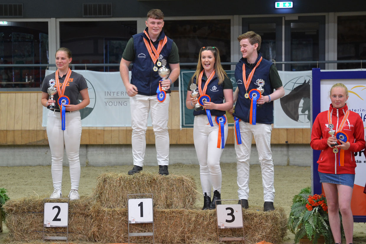 Mit der Theorie stand die erste der vier Disziplinen direkt nach der Ankunft am Donnerstag auf dem Programm. Hier waren 25 knifflige Multiple-Choice-Fragen auf Englisch zu beantworten. Am Freitag war ein gutes Auge gefragt, erst wurden Pferde im Freilaufen und Freispringen bewertet, danach Noten für das Exterieur vergeben. Nach Abgabe der Bögen konnte durch die ausführlichen Kommentare der Richter jeder noch etwas dazulernen. Die Königsdisziplin, das Vormustern auf der Dreiecksbahn, fand als Höhepunkt am Samstag statt. Hier war nach kurzer Eingewöhnungsphase ein fremdes Pferd an der Hand im Schritt und Trab den Richtern zu präsentieren – eine herausfordernde Aufgabe, die vom ganzen Team geschickt und mit viel Gefühl fürs Pferd gelöst wurde. Am Abend gab es eine beeindruckende Show zu bewundern, bei der unter anderem die holländischen „Tuigpaarden“ bejubelt wurden.