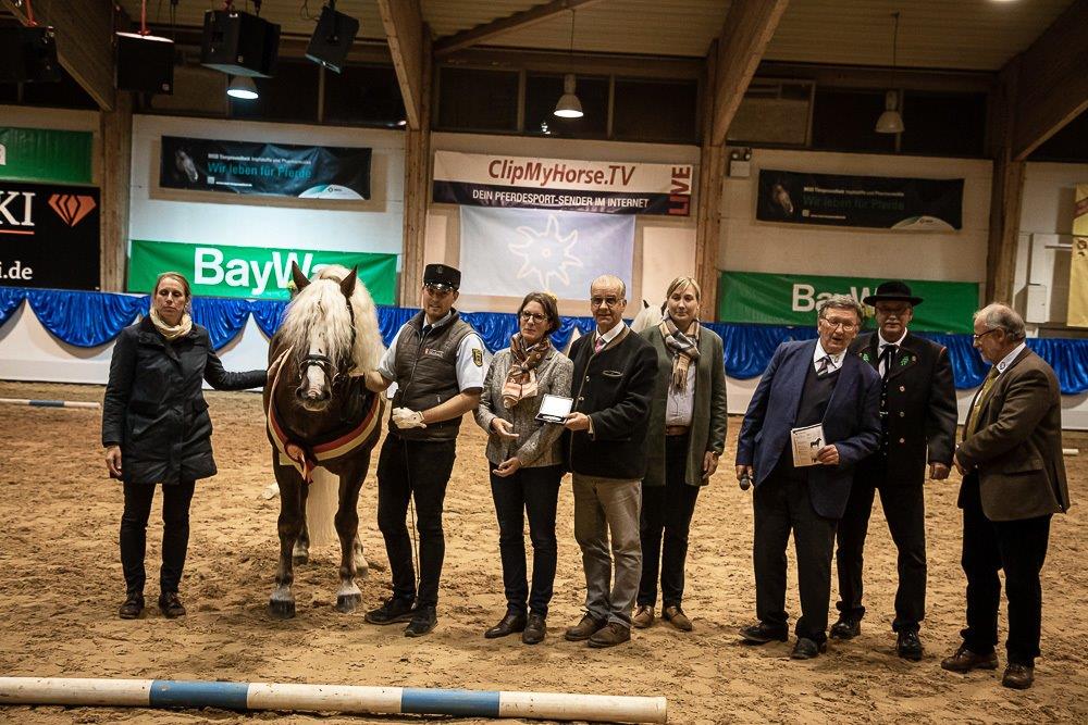 Die Abteilung der älteren Stuten führte souverän die diesjährige Rossfestsiegern, die siebenjährige StPr./LSt. Fiona vom Schmalzenhof an. Züchter- und Ausstellersohn Matthias setzte sie in beiden Grundgangarten perfekt in Szene. Heinrich Neumaier freute sich über die Bundessiegerschärpe, eine Medaille des Bundesministeriums und die Bundesprämie. Im Rahmen der Abschiedsparade am Sonntag wurde Fiona als fruchtbarste Stute mit vier Fohlen in vier Zuchtjahren mit dem Felix-Hösch-Wanderehrenpreis der Deutschen Landwirtschafts-Gesellschaft (DLG) ausgezeichnet. Auf den zweiten Platz setzte die Bewertungskommission mit den Zuchtleiterinnen Antje Lembke und Katrin Tosberg sowie Karlheinz Eckerlin die StPr./LSt. Hexle von Wilder Retter/Rubin von Roland Bäuerle. Er zeigte sich sichtlich gerührt über diesen Erfolg und die ausgesprochene Bundesprämie.
