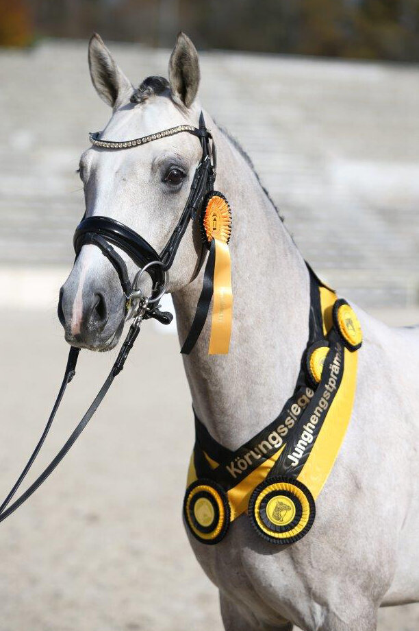 Der Ponykörung stellten sich heute fünf Hengste, drei von ihnen erhielten ein positives Körurteil. Als Siegerhengst herausgestellt wurde der Schimmelhengst Dorfrocker RB (DR, Z.: Reiner Bockholt, B.: Ponyzucht Hollenbach GbR). Der westfälisch gezogene Sohn des D-Gold AT NRW-FS Dr. Watson beeindruckte nicht nur durch seine Größe (154 cm). Antje Lembke lobte den charmanten Hengst mit dem tollen Auge und dem super Charakter für sein korrektes Fundament und die drei beeindruckenden Grundgangarten. Im Trab zeigte er eine tolle Schwebephase bei viel Raumgriff, der Schritt war gut geregelt mit viel Übertritt, der Galopp super im bergauf vorgetragen. Dorfrocker wurde gleich für zwei Kategorien gekört: Für das kleine Deutsche Reitpferd und das Deutsche Reitpony. Darüber hinaus wurde der Siegerhengst natürlich auch prämiert.
