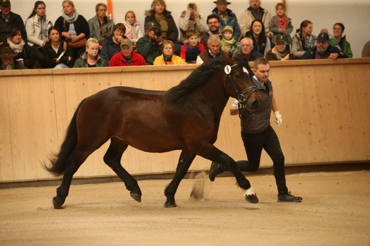 Dritter im Bunde der Prämienhengste war der von Sebastian Lemberger vorgestellte und von Christina und Alfred Laubis gezüchtete Dunkelfuchs Douglas von Domingo aus der LSt. Gretel von LVV Modem. Er überzeugte die Kommission aus dem Lot der vorgestellten Hengste mit gutem Rassetyp, raumgreifenden Bewegungen in den Grundgangarten und mit ausgeglichenem Interieur während der gesamten Vorstellung.