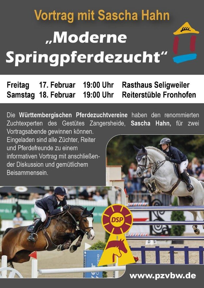 Die Württembergischen Pferdezuchtvereine haben den renommierten Zuchtexperten des Gestütes Zangersheide, Sascha Hahn, für zwei Vortragsabende gewinnen können. Eingeladen sind alle Züchter, Reiter und Pferdefreunde zu einem informativen Vortrag mit anschließender Diskussion und gemütlichem Beisammensein.