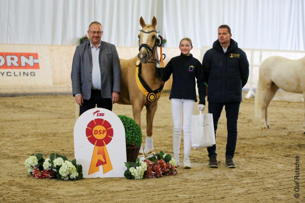Die mit drei Startern kleine, aber feine Abteilung der Dressurponys wurde von der hochsympathischen Palominostute „Donnerlottchen“ (Diamond Touch NRW/FS Dior de Luxe; Z.: Karl & Maria Geiselhart, Trochtelfingen; B.: ZG Grab, Ehingen) mit 7,70 gewonnen. Gleiches gilt für den Auftritt von „Nevada“ (Neverland WE/Movie Star; Thomas & Bärbel Brugger, Medlingen). Die schicke Palominostute überzeugte im Wettbewerb „DoppelTalent“ mit gleichermaßen guten Grundgangarten und sehr souveränem Freispringen.
