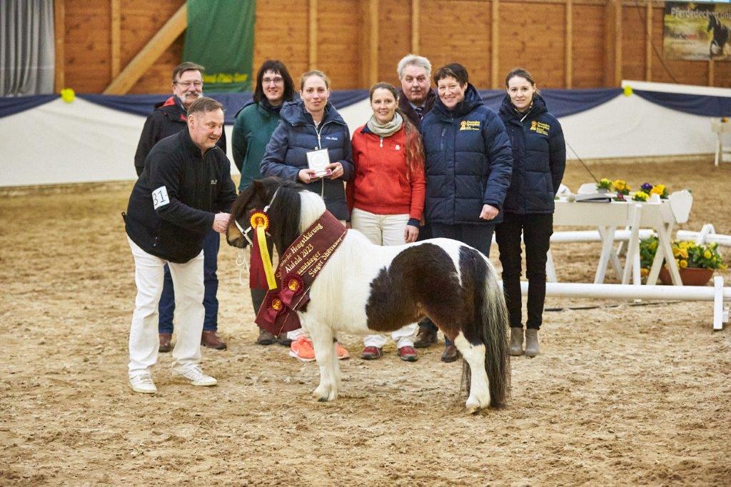 Den Reservesieg des zweiten Tages in Alsfeld konnte sich ein noch recht jugendlicher Vertreter der Rasse Paso Pferd sichern. Scaramouche Magic stammt aus der Zucht von Gerhild Achrainer und wurde von David Hofmann vorgestellt. Bei deutlicher Veranlagung für die Gangart Tölt zeigte er einen taktklaren Trab mit energisch abfußendem Hinterbein und konnte zudem mit balancierter und über genug Raumgriff verfügender Galoppade gefallen. Der Sohn des MVM Oro de Nienover erhielt die Prämienanwartschaft. Mit Steinburgs Talisman (Shetlandpony u. 87 cm) konnte ein weiterer Hengst als Siegerhengst der Anerkennung und mit Prämierung bedacht das Pferdezentrum verlassen. Der Hengst, aus der Zucht von Tanja Ehlers, konnte mit ansprechenden Partien im Körper bei solidem Fundament und guter Gangmechanik überzeugen und Simone Glück durfte ich als Ausstellerin freuen, die Glückwünsche zu empfangen.