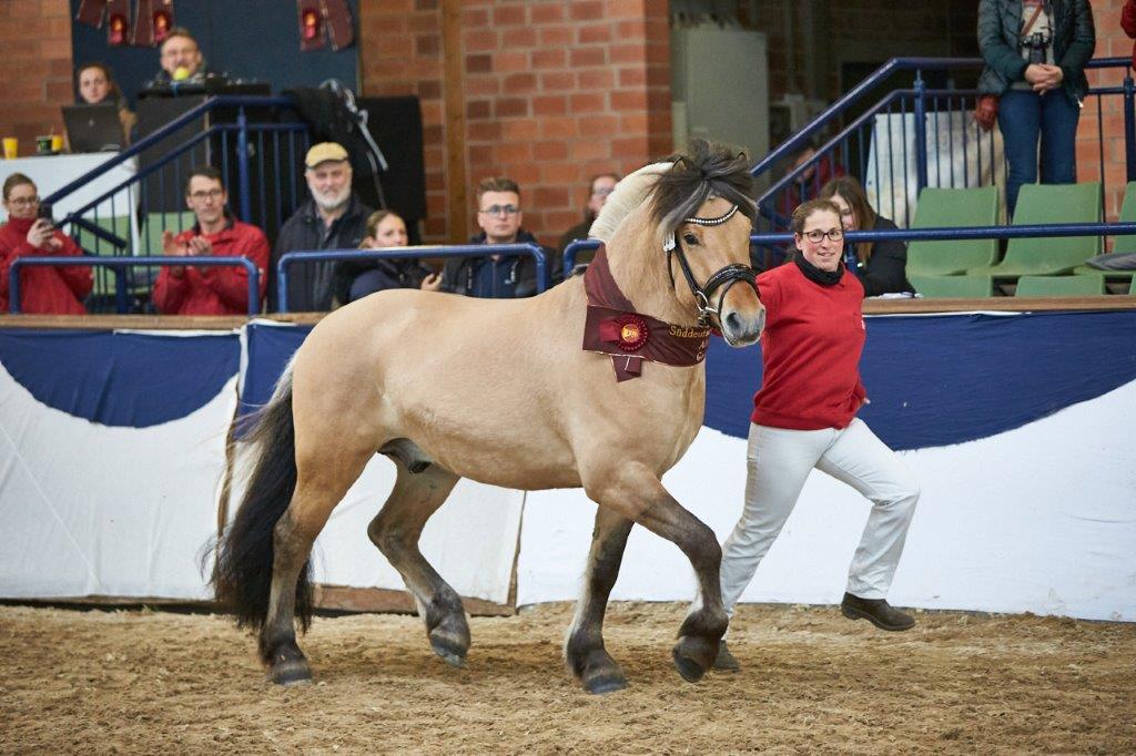 Als Siegerhengst der Sportponyrassen konnte ein Junghengst der Rasse Fjordpferd auftrumpfen. Der Sohn des Giersbergs Tjure aus der Zucht von Monika Bauschbach und ausgestellt von der Burkhard und Katharina Neuß GbR wusste vollends zu überzeugen. Im Seitenbild beeindruckte dieser typvolle Braunfalbe mit viel Körperharmonie, einer guten Dreiteilung und Körperschluss. In den schwungvollen Bewegungen zeigte er sich mit Takt, dem benötigten Raumgriff sowie Abdruck aus dem Hinterbein und konnte auch am Sprung mit guten Reflexen und der benötigten Übersicht beeindrucken.
