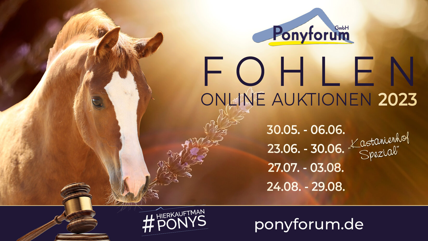 Über die Homepage der Ponyforum GmbH können die Fohlen direkt zu einem der Auswahltermine angemeldet werden: ZUR HOMEPAGE. Hier finden Sie ebenso alle weiteren Infos zu den Auktionen, die Beschickerbedingungen usw. Bei allen Fragen melden Sie sich gerne direkt bei unserer Ansprechpartnerin Verena Prior, Tel +49 173 278 65 78 oder per Email an v.prior@ponyforum-online.de