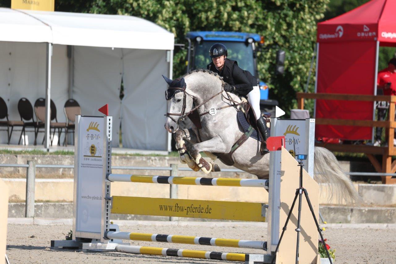 In der Springpferdeprüfung der Klasse S* mit Stechen für sieben- und achtjährige Pferde hatten sich 20 Paare in die Starterliste eingetragen, sieben von ihnen konkurrierten außerdem um das Goldene Band für das beste Pferd aus der Landeszucht. Dieses sicherte sich am Ende die Zweitplatzierte: Clearfeary, eine Tochter des Clearline Z-Quinar aus der Zucht und in Besitz von Wolfgang Biesinger, unter dem Sattel von Elisabeth Meyer. Die beiden waren als eines von vier Paare mit einer fehlerfreien Runde ins Stechen eingezogen und lieferten dort die zweitschnellste Zeit mit 40,40 Sekunden. Seit 2021 sitzt Elisabeth Meyer im Sattel der Stute und hat diese von Springpferdeprüfungen der Klasse A bis zur schweren Klasse gefördert - nun krönten die beiden ihre bisherige Laufbahn mit dem Goldenen Band. Den Sieg in der Prüfung sicherte sich Markus Kölz im Sattel von Bruno v. Quintero's Cassiny (Tsch.W., B.: Michael Obst). Die Zeit von 39,79 Sekunden im Stechen, war nicht zu schlagen. Das zweitbeste Pferd aus der Landeszucht rangierte auf Platz 5: King Lui v. Toulon (Z.: Eberhardt Werner, B.: Geoffrey Sutton) unter Jochen Schelling.