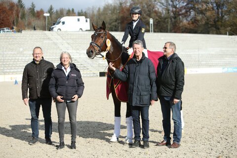 Zehn der 15 punktbesten vierjährigen DSP- Dressurpferde und die Sieger der sieben Qualifikationen traten zum Finale des Gert Gussmann Cups, einer Dressurpferdeprüfung Kl. A, anlässlich des Marbacher Wochenendes an. Dank treuer Sponsoren war das Finale mit 1.000 Euro dotiert. Den Sieg sicherte sich Ellen Stengele mit dem Landbeschäler Benedikt von Ben Benicio/Quaterback aus der Zucht von Dr. Frank Klakow mit einer Wertnote von 8,1. Das Haupt- und Landgestüt Marbach entdeckte den imposanten Hengst bei den DSP-Hengsttagen 2020.