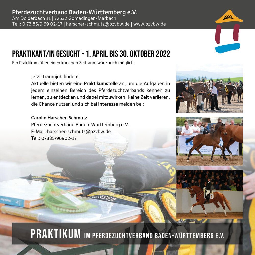 Aktuelle bieten wir eine Praktikumstelle an, um die Aufgaben in jedem einzelnen Bereich des Pferdezuchtverbands kennen zu lernen, zu entdecken und dabei mitzuwirken. Keine Zeit verlieren, die Chance nutzen und sich bei Interesse melden bei: